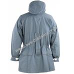 Wendetarnjacke von Grau auf Weiss, Kapuze mit extra Windleiste, je Seite 3 Brustaschen, 2 wendebare Gesästaschen, Schnallriegel an den Ärmelenden, Tailienschnürzug und Knopfleiste zum Befestigen der Jackenschöse (damit diese bei Wind nicht hochklappen).