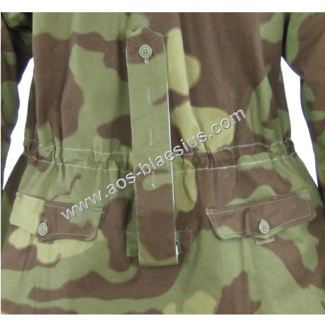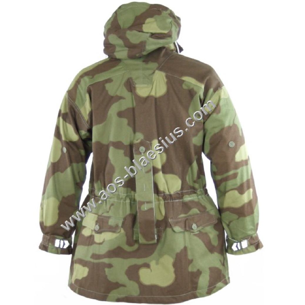 Wendetarnjacke von Italien Tarn auf Weiss, Kapuze mit extra Windleiste, je Seite 3 Brustaschen, 2 wendebare Gesästaschen, Schnallriegel an den Ärmelenden, Tailienschnürzug und Knopfleiste zum Befestigen der Jackenschöse (damit diese bei Wind nicht hochklappen).